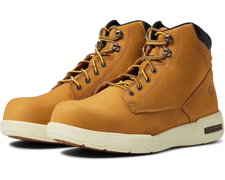 Need an extra jolt in your work day? The Wolverine® Kickstart CM 6″ work boots feature a lightweight, sneaker-inspired silhouette with the comfort of a work boot to make sure that wherever the job takes you, you’re protected.SKU: #9528839Style number W211115 (Wheat), W211116 (Black).Removeable DuraShocks® polyurethane insole designed to offer exceptional comfort for continued wear.Polyurethane DuraSpring™ low density midsole for a lighter wear with plenty of support and rebound.CarbonMAX composite safety toe meets the ASTM F2413-18 M I/75 C/75 safety standards and is lighter without sacrificing solid support.DuraShocks® dual suspension pads in the outsole provide shock absorption and custom energy return with every footfall.Lace-up closure with six pairs of eyelets.Padded collar for ankle support.Nubuck leather upper with handstitched detailing.Textile mesh lining with moisture-wicking properties to keep you cool and dry.Cement construction for a lightweight, durable shoe.Slip resistant outsole meets Mark II standard.Imported.Product measurements were taken using size 9, width D – Medium. Please note that measurements may vary by size.Weight of footwear is based on a single item, not a pair.Measurements: